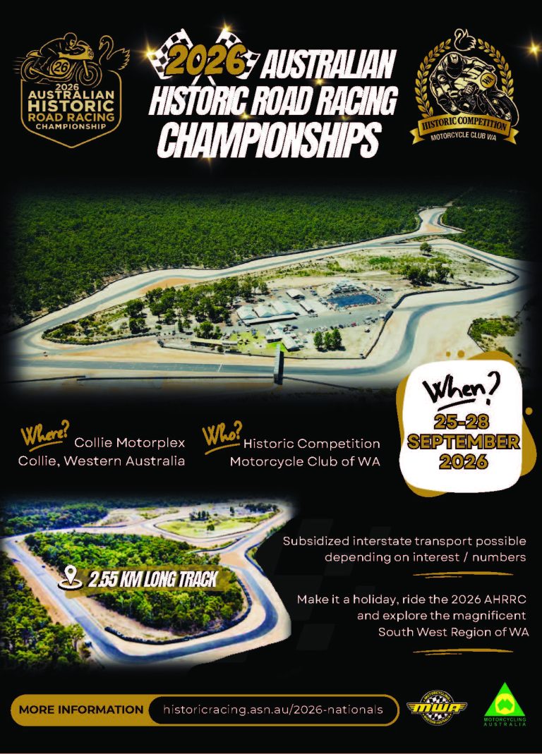 2026 Australian Historic Road Racing Championships When: Friday 25th September until Monday 28th September 2026Where: Collie Motorplex – 643 Powerhouse Rd, Collie Burn WA 6225More Details:Friday – Tuning/PracticeSaturday – Qualifying and Evening Meet and Greet FunctionSunday – RacingMonday – Racing and Presentations